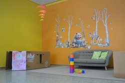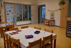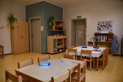 - Spiel- und Kreativraum: Dieser Raum wird vorrangig für gemeinsame Tisch- und Regelspiele und altershomogene Angebote genutzt. Im Kreativbereich können die Kinder malen, basteln und sich handwerklich ausleben. Der angrenzende Leseraum ist durch eine Glaswand und eine Tür zum Gruppenraum abgegrenzt. Er verfügt über ein Sofa mit Bücherturm und lädt die Kinder zu einem Bilderbuch in ruhiger Atmosphäre ein. Ein kleiner Tisch wird für Intensivangebote und Portfolioarbeit in Kleingruppen genutzt.