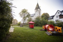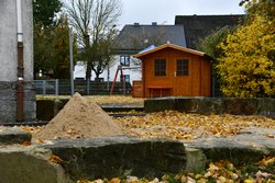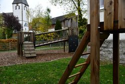 - Außengelände: Auch das weitläufige Außengelände ist jederzeit bespielbar und umgibt nahezu das ganze Gebäude. Es ist naturnah und mit einem Klettergerüst, sowie einem großen Sandkasten mit dazugehöriger Sandkiste ausgestattet. Die Kinder werden an der frischen Luft zum bewegten Spiel angeregt.