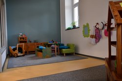 - Bau- und Konstruktionsraum: Hier stehen den Kindern drei Flächen zur Verfügung. Auf den Teppichen befinden sich wechselnd verschiedene Konstruktionsmaterialien, an denen sich die Kinder erproben und ausprobieren können. Außerdem verfügt der Raum über eine Ebene mit einer kleinen Rampe. Durch eine große Glasfront wird der Rollenspielraum ebenfalls vom Gruppenraum separiert. Die Puppen- und Küchenecke, sowie Verkleidungsmaterialien und der Kaufladen stehen den Kindern jederzeit zur freien Verfügung und laden zum vielseitigen Rollenspiel ein.