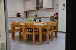 - Küche: Durch eine Glaswand ist die Küche vom Flur abgetrennt. Dieser steht allen Kindern zur Verfügung. Dort werden sie angeleitet, selbstständig zu frühstücken und für die Sauberkeit ihres Frühstücksplatzes zu sorgen, sowie ihr Geschirr in die Spülmaschine einzuräumen. Das gemeinsame Mittagessen findet ebenfalls in diesem Bereich statt.